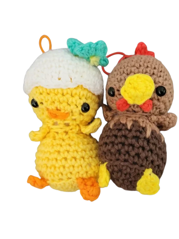 Je vous propose de former votre duo poule et/ou poussin. Le choix du poussin se fait suivant la couleur de la fleur sur la coquille. Idéal pour votre décoration ainsi que vos cadeaux de Pâques.  Ces charmants petits amigurumis sont munis d’un fil d’accroche et de yeux de sécurité.