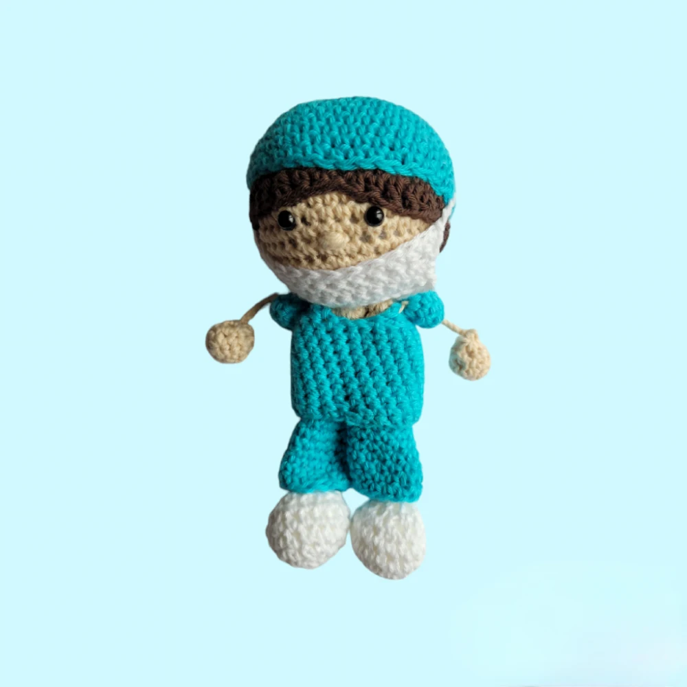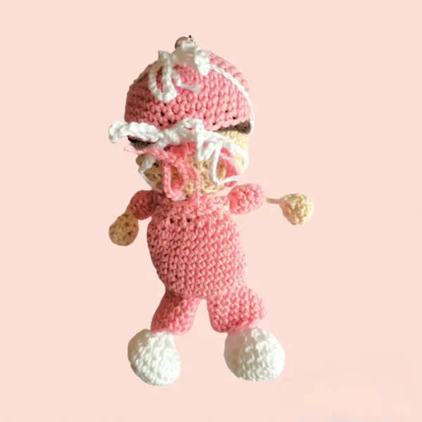 Personnel soignant soit blouse bleue soit blouse rose. Avec calot fixé et masque retirable. Yeux de sécurité et porte-clé Dimension : 16 cm