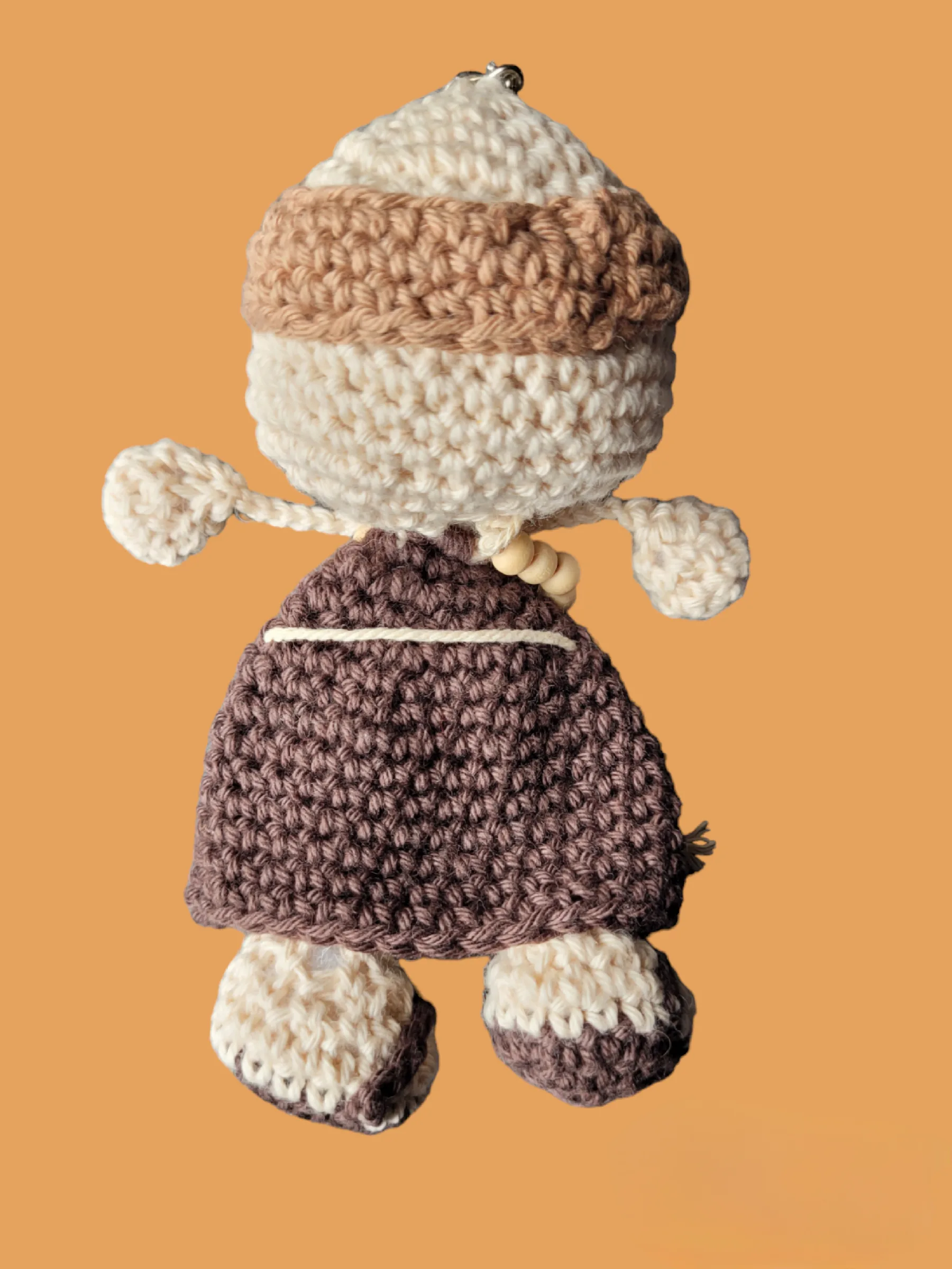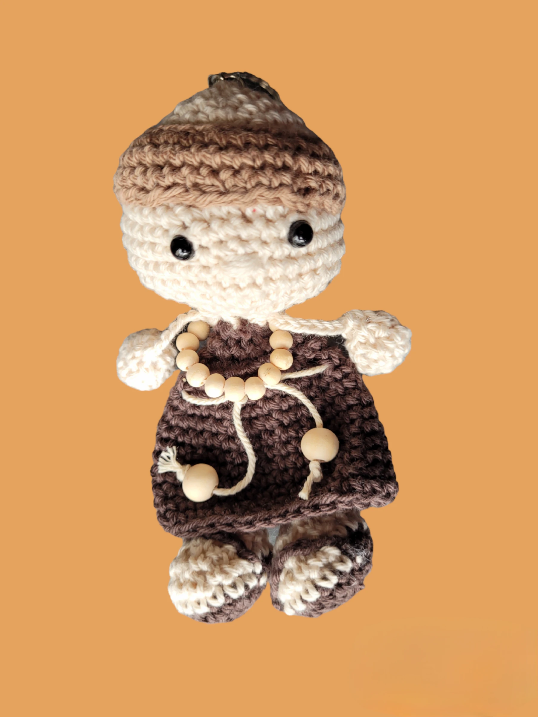 Moine tout rigolo avec sa tonsure. Collier et ceinture de perles en bois. Yeux de sécurité. Porte-clé. Dimension :  13 cm