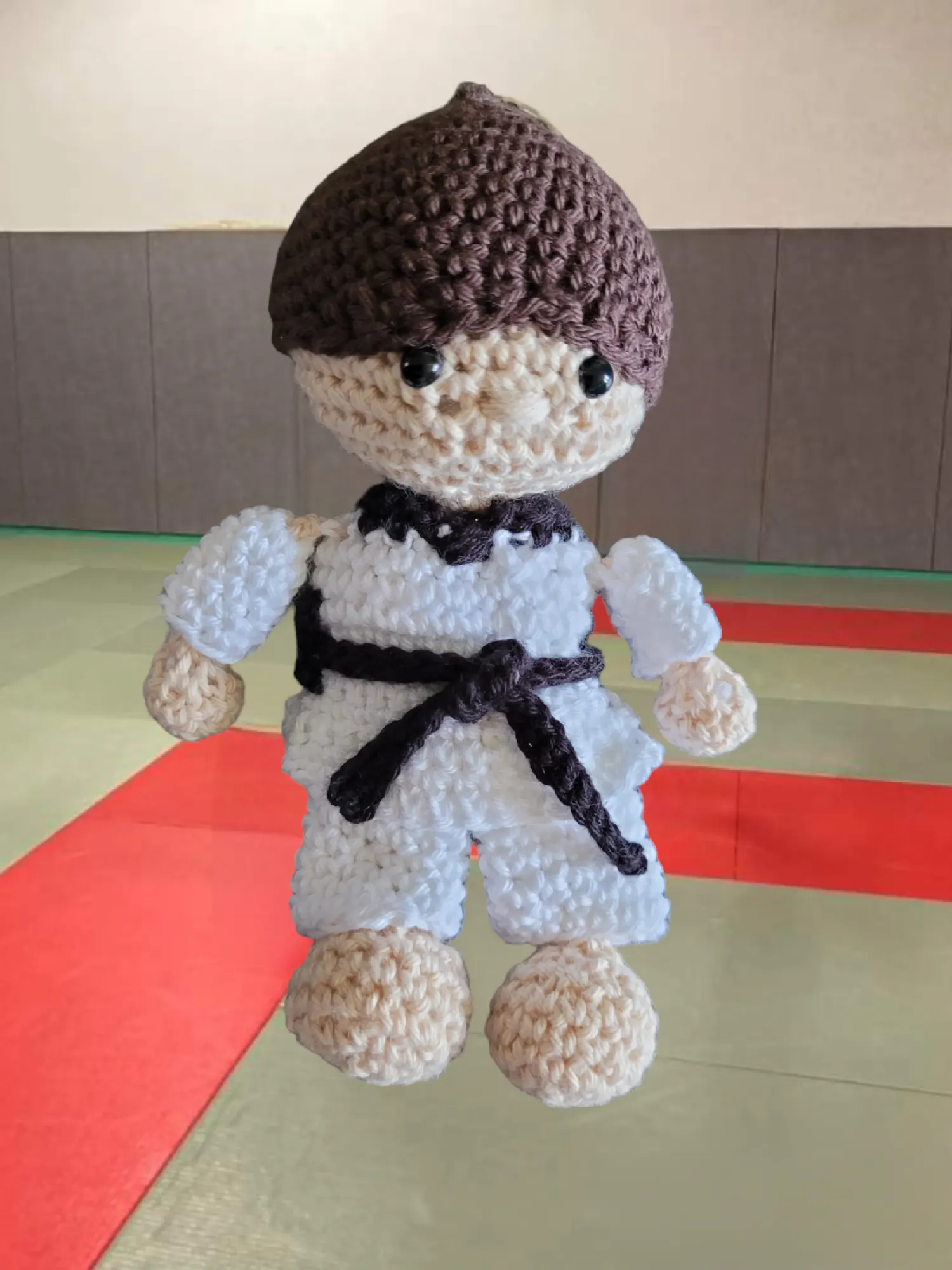 Bambola taekwondoïste ceinture noire , dobok col noir,  cheveux marron courts, yeux de securité, porte-clé. Dimension : 16 cm